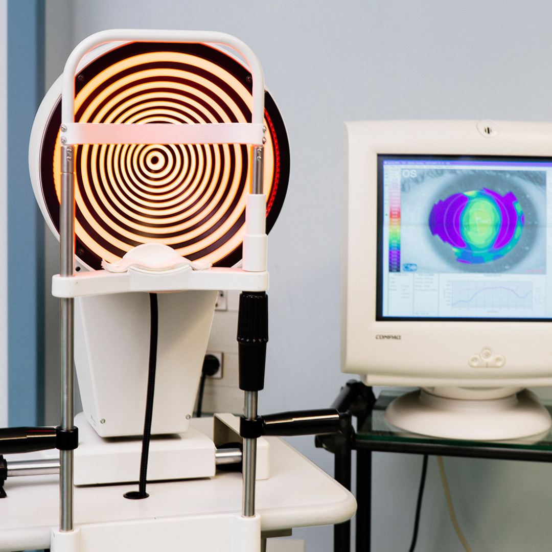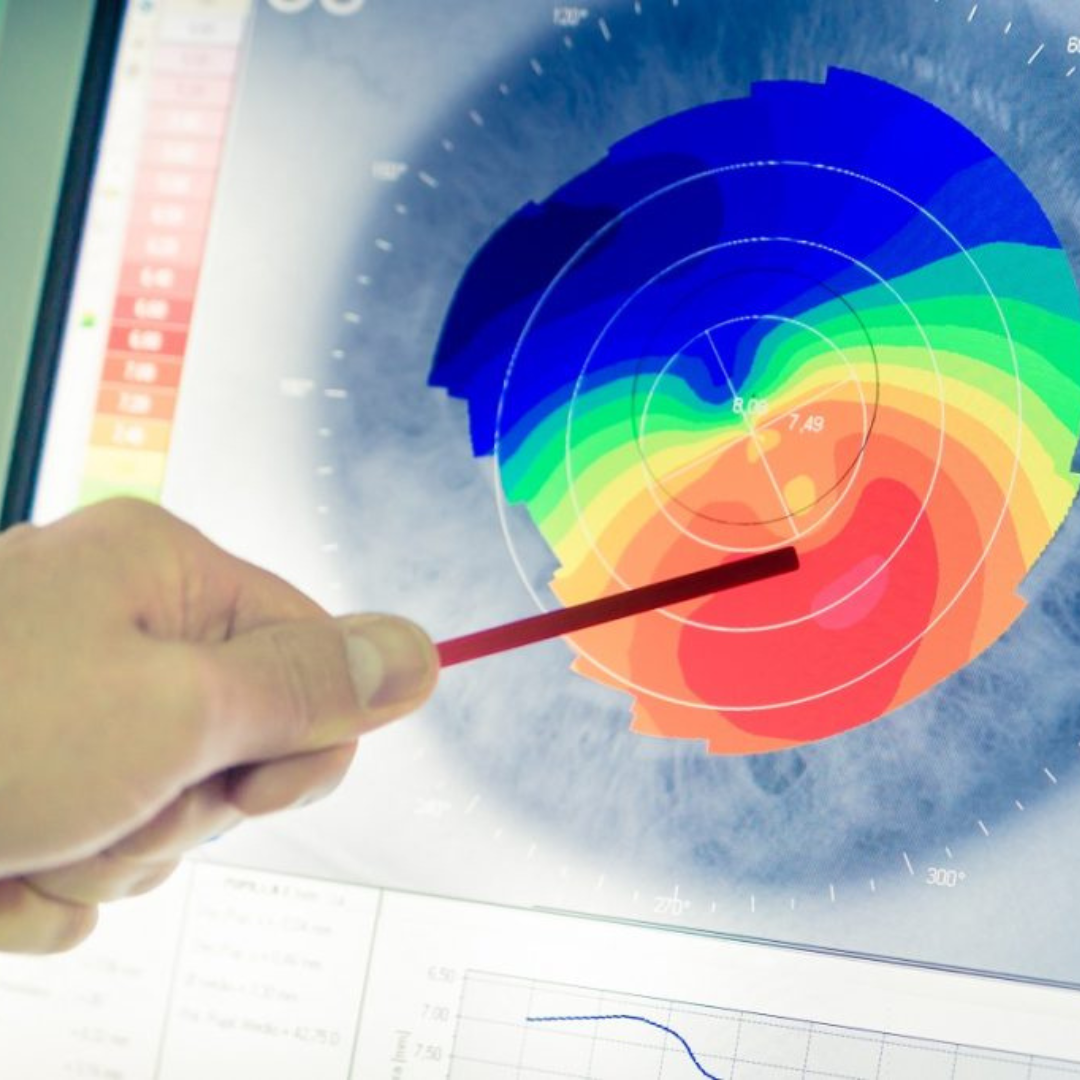 Esame avanzato che analizza in dettaglio la superficie della cornea, fondamentale per identificare patologie come il cheratocono o per personalizzare le lenti a contatto.